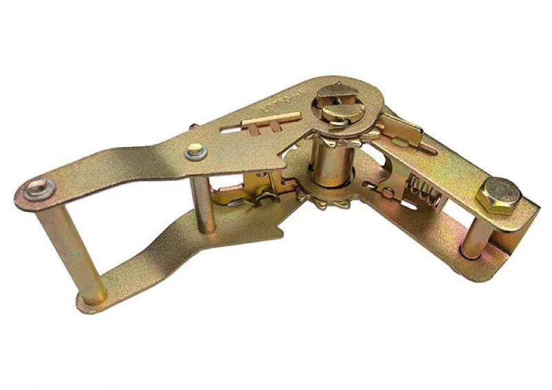 Натяжное устройство (храповой замок, трещотка) предотвращает ослабление ленты, закрепляющей груз, во время движения транспорта, что обеспечивает безопасность участников движения и сохранность перевозимых товаров.Храповой замок (трещотка) основан на работе храпового механизма. Храповой механизм (храповик) - зубчатый механизм прерывистого движения, предназначенный для преобразования возвратно-вращательного движения в прерывистое вращательное движение в одном направлении. Храповик обычно имеет форму зубчатого колеса с несимметричными зубьями, имеющими упор с одной стороны. Движение колеса в обратную сторону ограничивается собачкой, которая прижимается к колесу пружиной или под собственным весом.