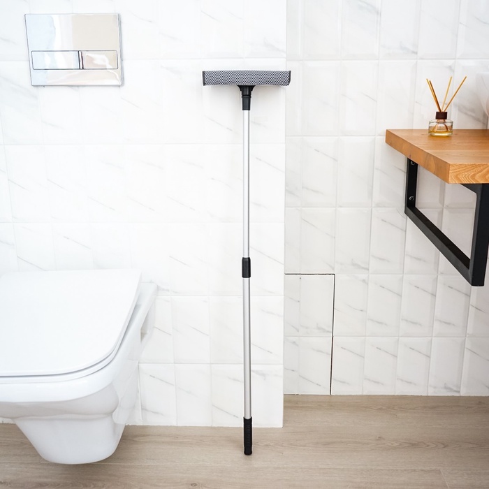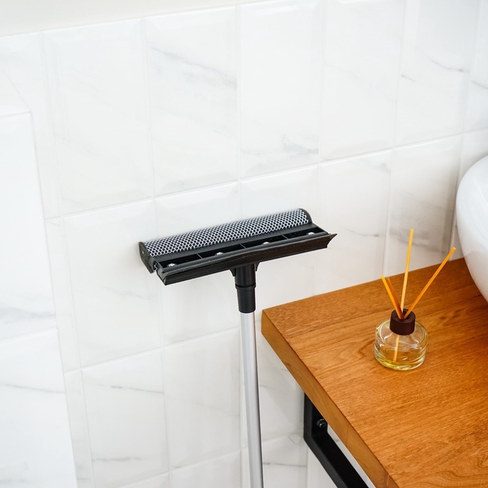 Установите скребок в верхнем левом углу окна и, прижимая к стеклу, ведите швабру сверху вниз, сгоняя воду и грязь, до нижнего края рамы.